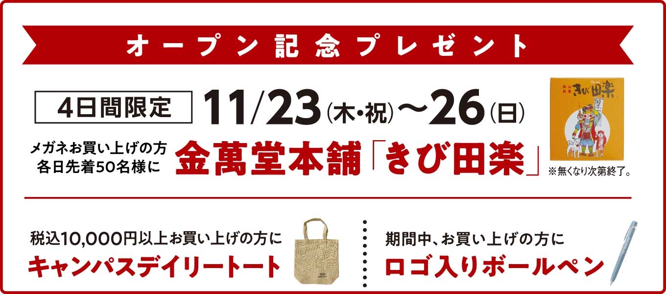 オープンを記念し、11月23日(木祝)~26日(日)4日間限定で、メガネをお買い上げの方 各日先着50名様に金萬堂本舗の「きび田楽」をプレゼントいたします。また、期間中税込10,000円以上お買い上げの方にキャンパスデイリートートを、期間中お買い上げの方にオリジナルボールペンをプレゼントいたします。