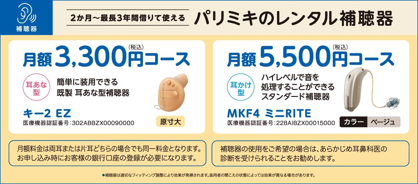 パリミキのレンタル補聴器なら、お手軽な月額3,300円(税込)コースから選べます。購入するのが不安な方は、まずはレンタルから始めてみませんか?