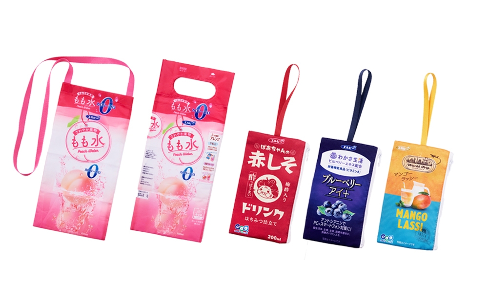 「さわやか果物 もも水」は、トートバッグとショルダーバッグで2種類、「ばあちゃんの赤しそドリンク、ブルーベリーアイ+、WorldTripマンゴーラッシー」はそれぞれポーチで3種類ラインナップしています。