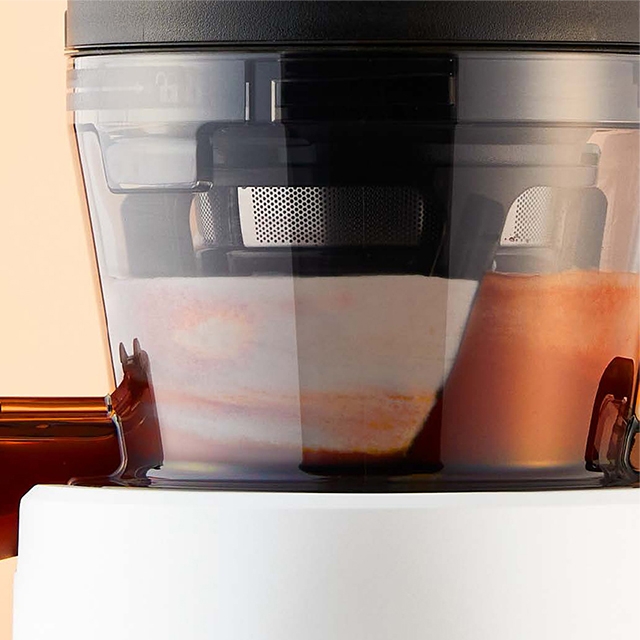 独特の“ひねり”が刻まれたスクリューが、両手で食材をギュッと搾るように水分を抽出し、網目のサイズや強度にこだわって設計されたストレーナーが果肉や繊維をろ過してくれるので、シルキーで心地よい飲み口に。そのうえ、1分間に43回転と低速で回転することで発熱と酸化を抑え、新鮮で濃厚なジュースを搾汁します。