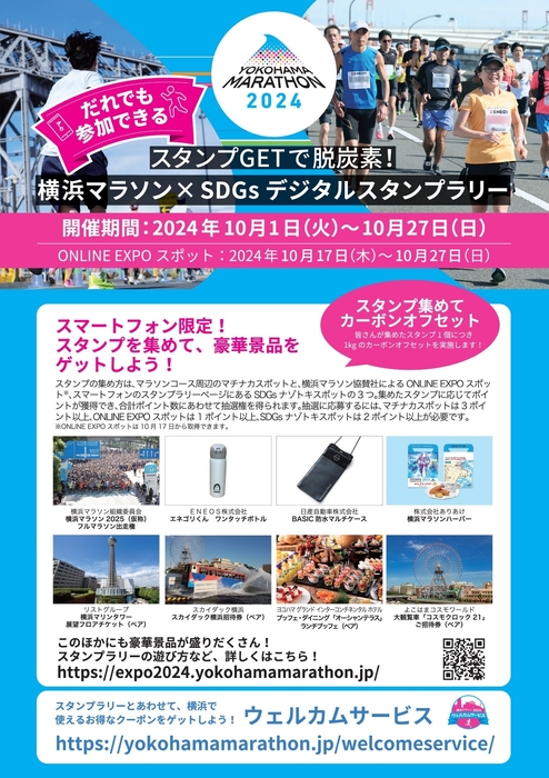 10月27日(日)に開催される「横浜マラソン2024」(主催‧横浜マラソン組織委員会)では、誰でも楽しめる関連イベント「スタンプGETで脱炭素!横浜マラソン×SDGsデジタルスタンプラリー」と「ウェルカムサービス(デジタルクーポン)」を、本日10月1日よりスタートいたしました。
