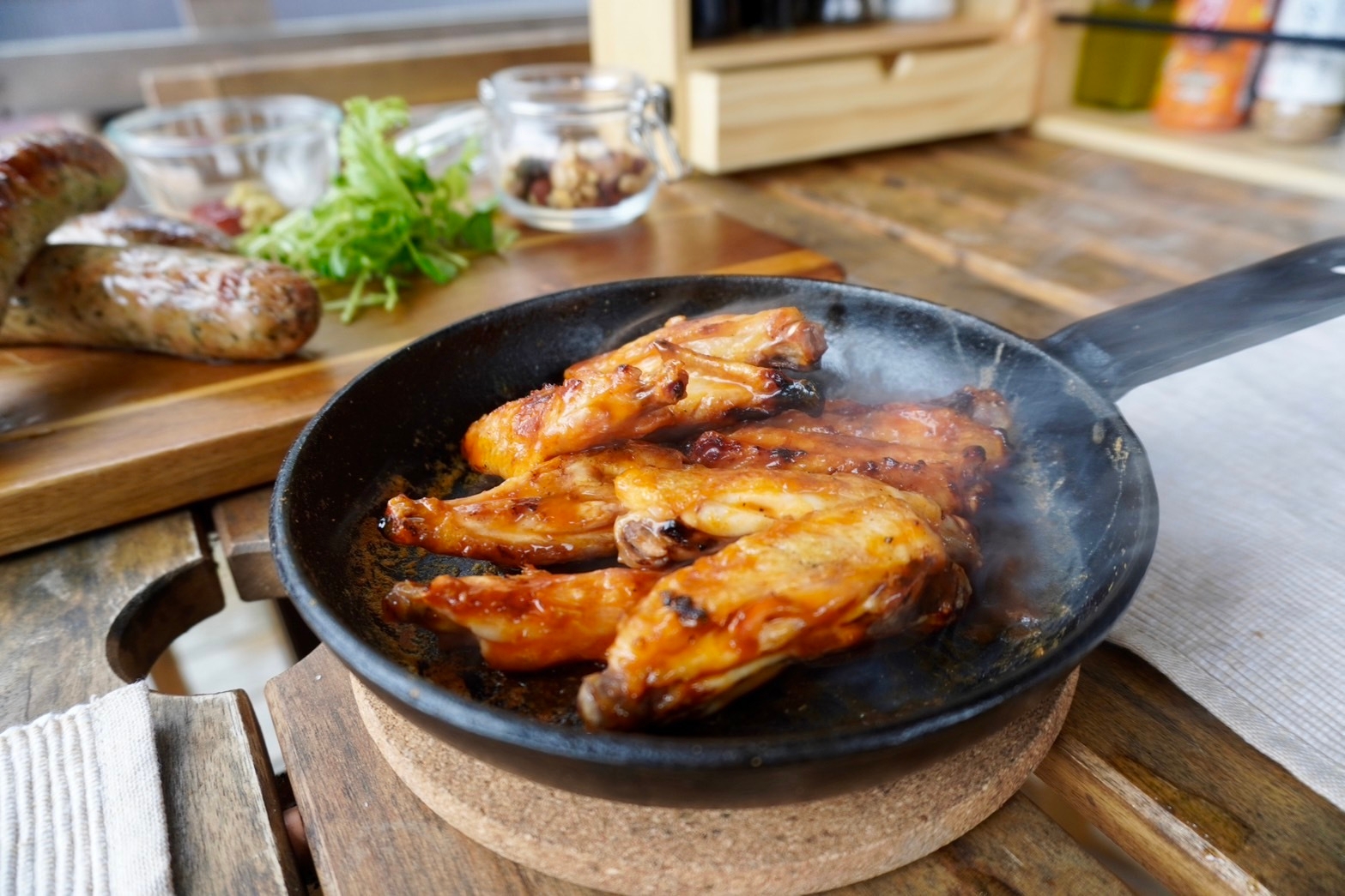 ナチョス、スモークナッツ、メキシコ仕立てのシーザーサラダ、チャックロール 1ポンドステーキ、バッファローウィング、ハーブソーセージ、アヒージョ、パン