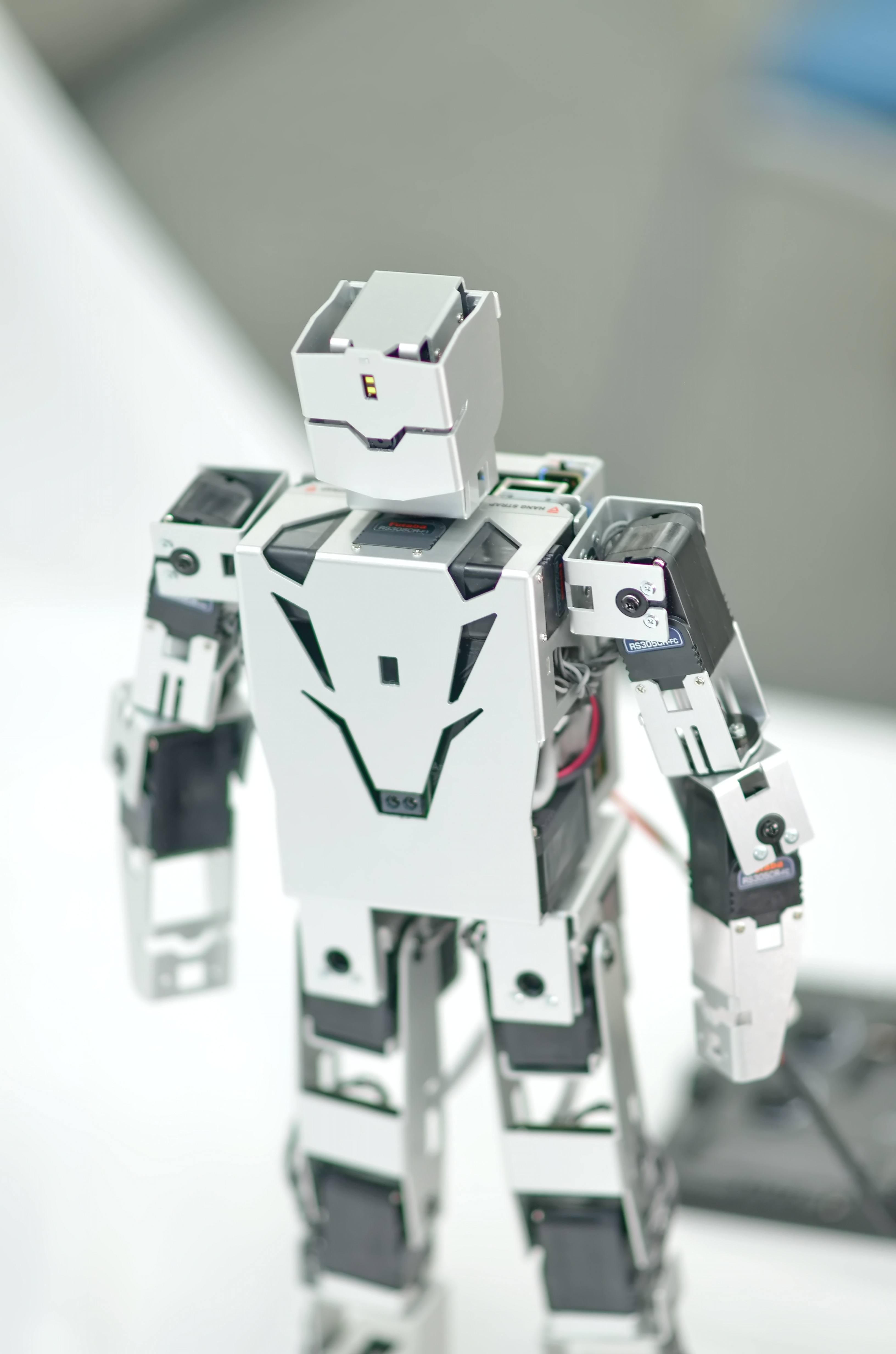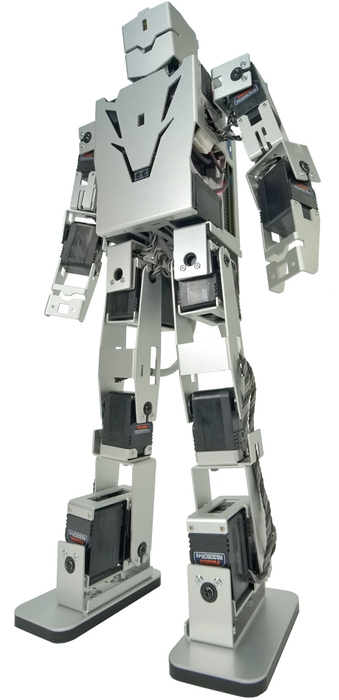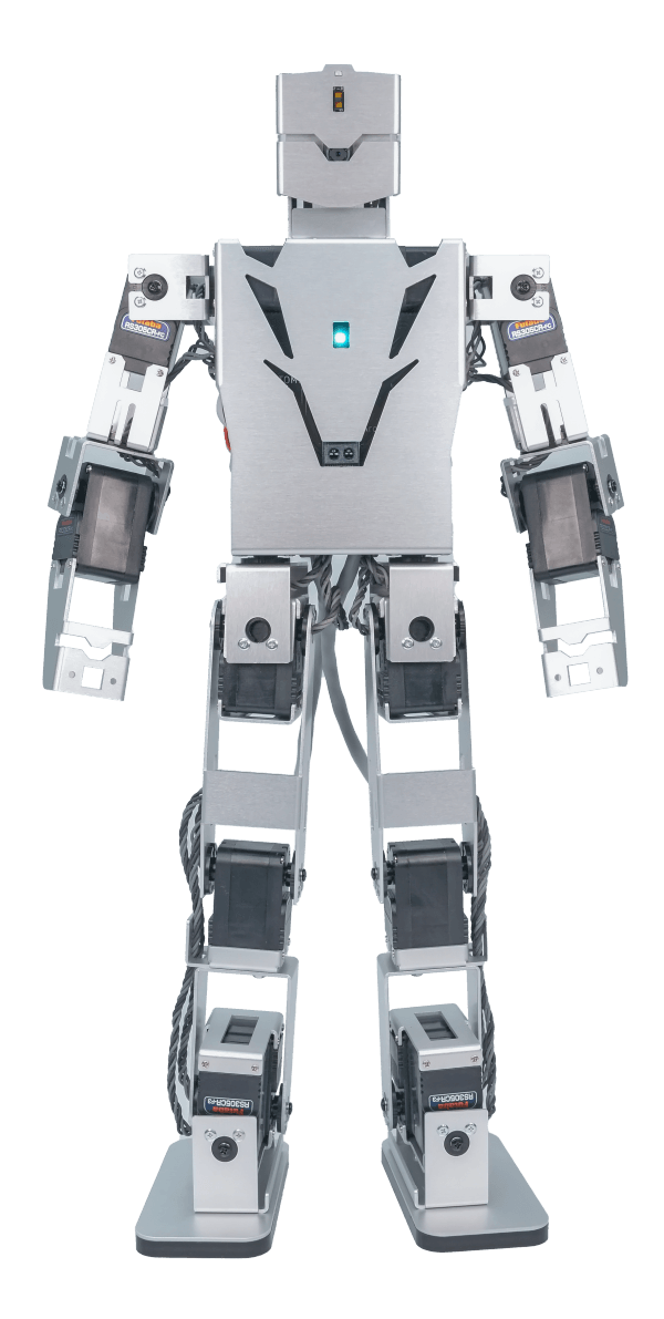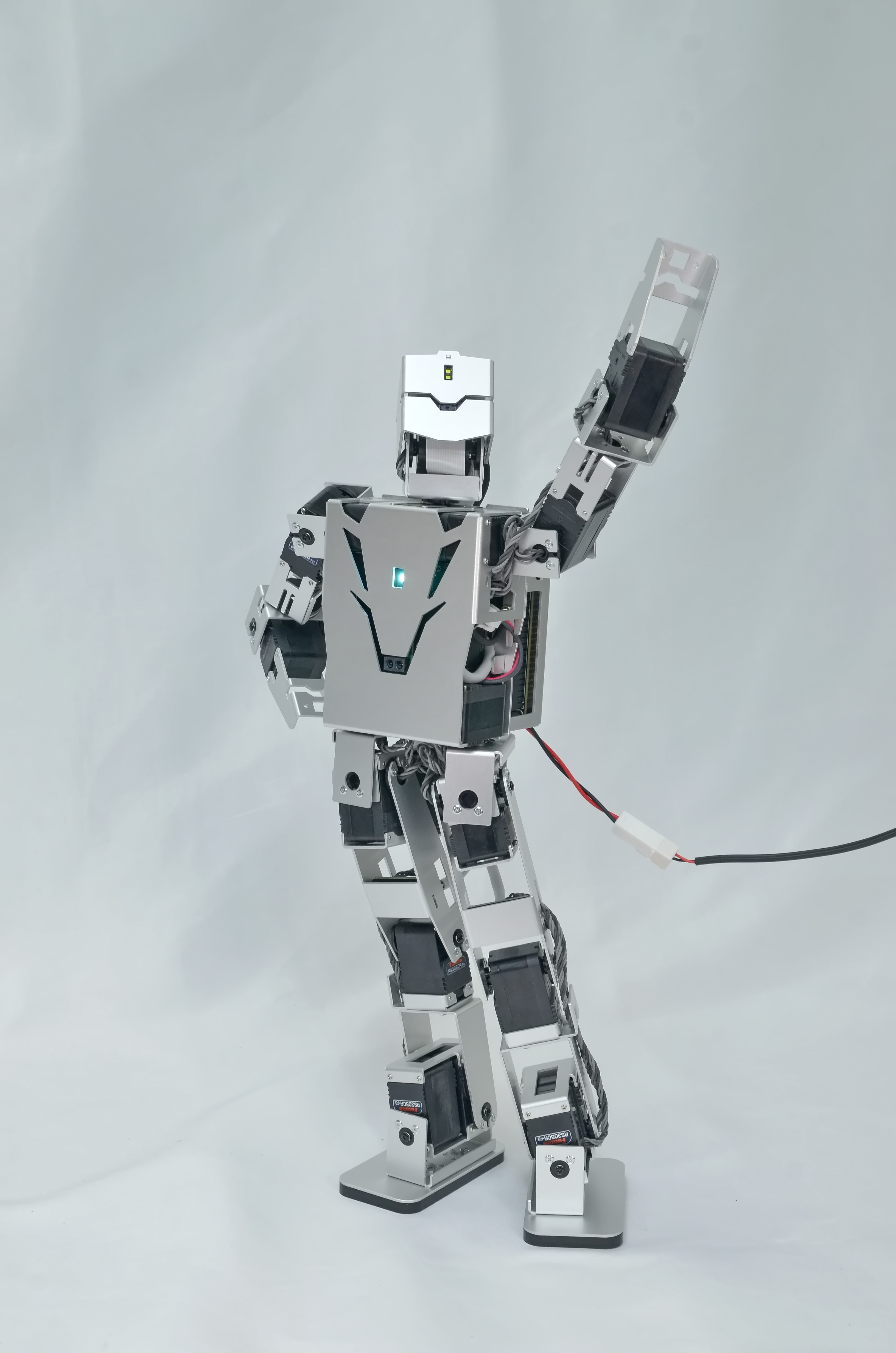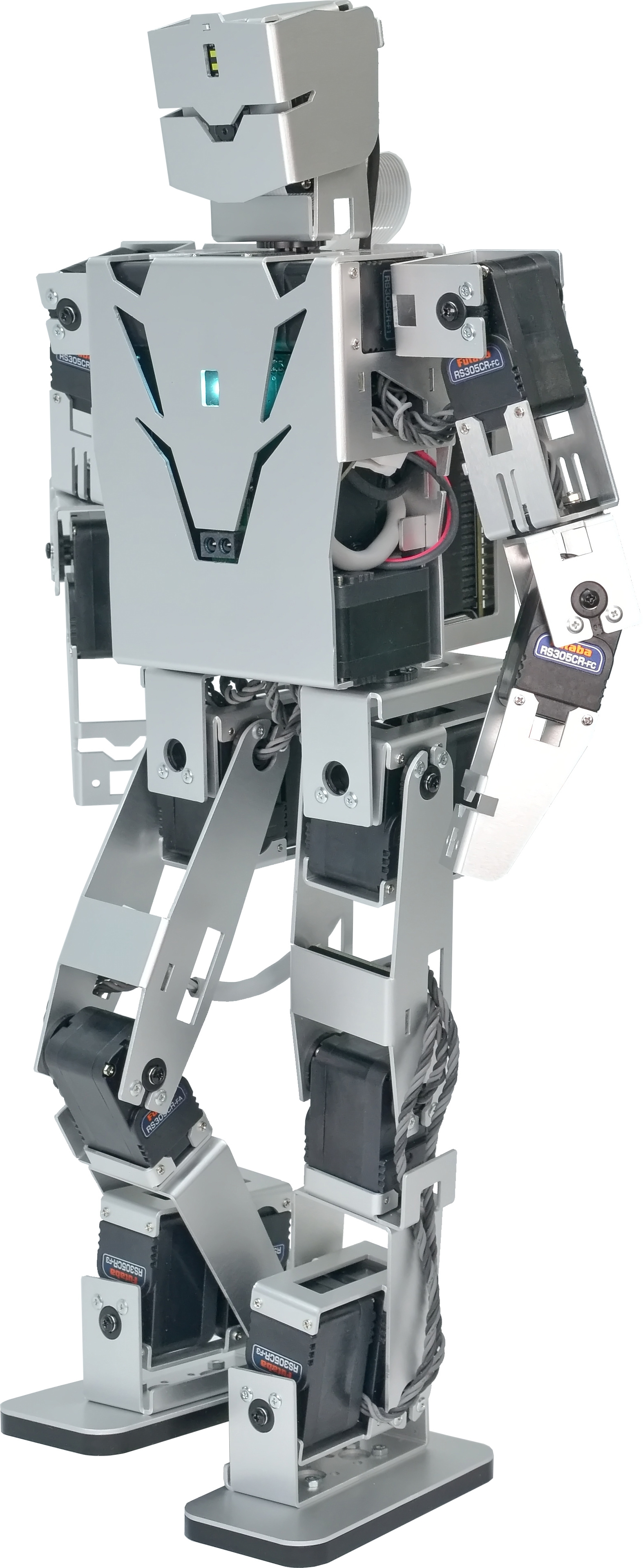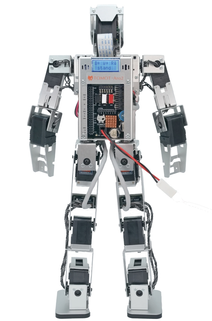 「TOMOT-Aro2」は、Linux OSを搭載した小型PCをメインコンピューターとする、20軸の関節自由度を備えた人型2足歩行ロボットです。