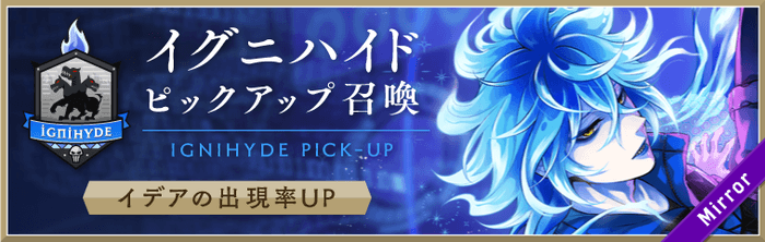 「イグニハイド ピックアップ召喚」では、ピックアップ対象のキャラクターの提供割合が、同じレアリティの他キャラクターよりもアップいたします。