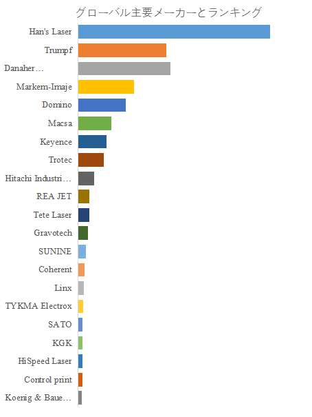 LP Informationのトップ企業研究センターによると、レーザーコーディングおよびマーキング装置の世界的な主要製造業者には、Han's Laser、Trumpf、Danaher (Videojet and FOBA)、Markem-Imaje、Domino、Macsa、Trotec、Keyence、Hitachi Industrial Equipment、REA JETなどが含まれている。2024年、世界のトップ10企業は売上の観点から約75.0%の市場シェアを持っていた。