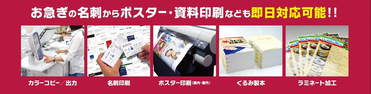 即日の仕上がりも可能な迅速で幅広いプリントサービスで、地域のみなさまのビジネスをサポートいたします。