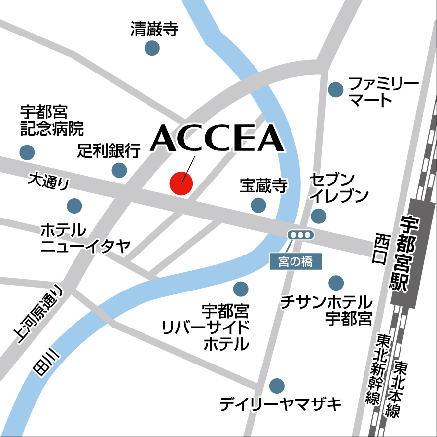 アクセア 宇都宮駅前店は、JR「宇都宮駅」西口より徒歩5分・宇都宮LRT「宇都宮駅東口駅」より徒歩8分と好アクセスな立地に御座います。