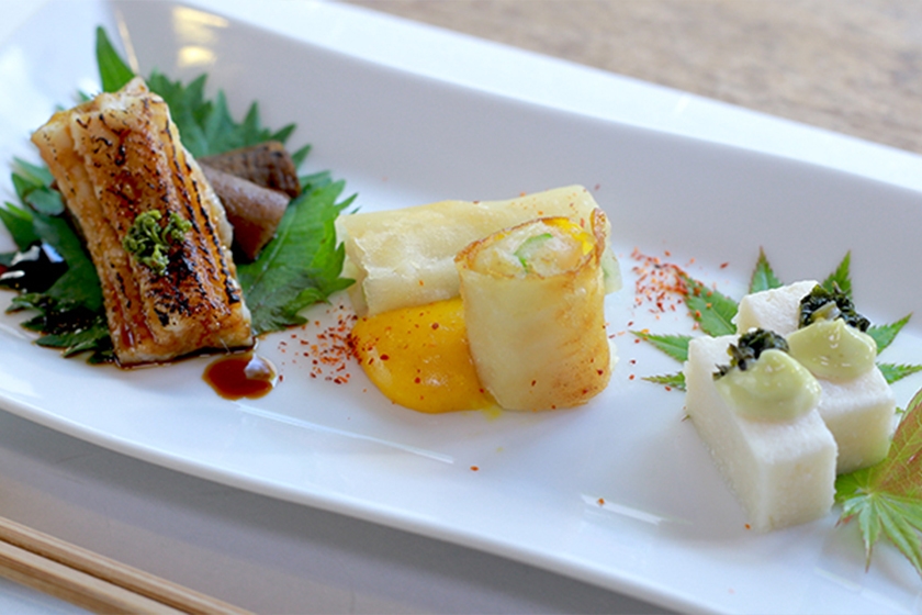 カリフラワー豆腐/海老アスパラ焼春巻/煮穴子