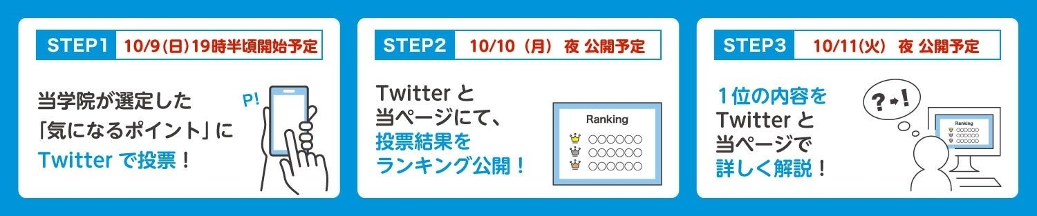 本試験で気になったポイントをTwitterで受験生が投票、翌10日(月)に投票結果をランキング形式で公開、11日(火)に投票結果をうけて当学院がコメントを公開いたします。 試験終了後に受験生が抱えるモヤモヤした気持ちを当学院がスッキリ解決します!