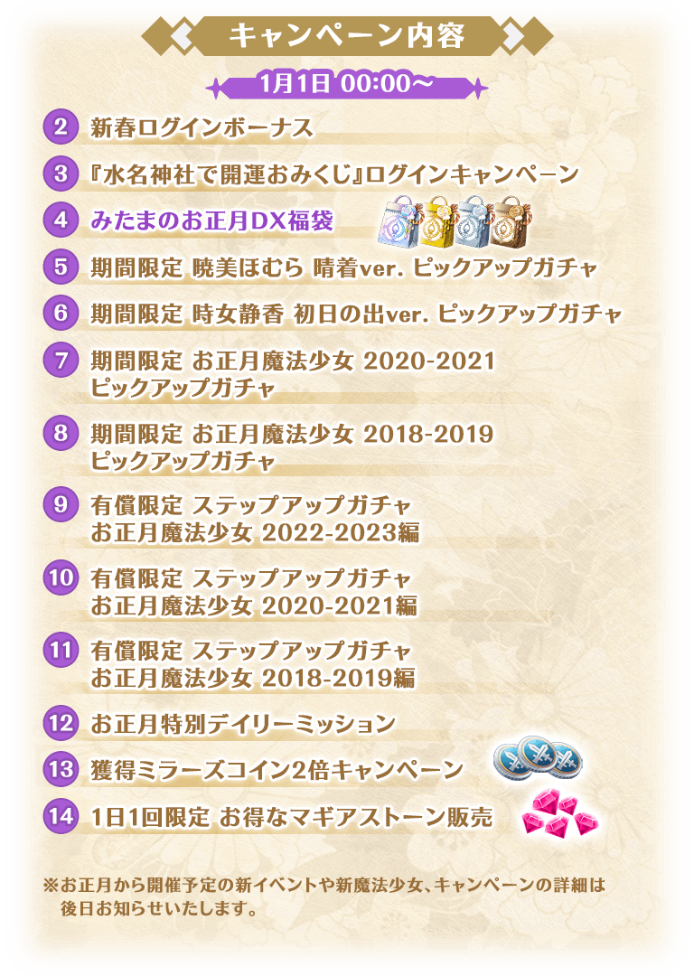 蒼樹うめ描き下ろしのキャラクターが多数登場するスマートフォンゲーム『マギアレコード 魔法少女まどか☆マギカ外伝』(iOS/Android/Windows向けアプリ 基本プレイ無料 ※一部アイテム課金あり)は、12月31日16:00より、『お正月キャンペーン』の開催を予定しております。