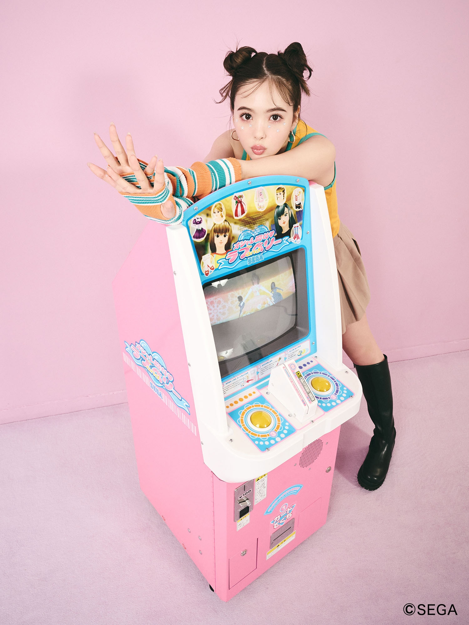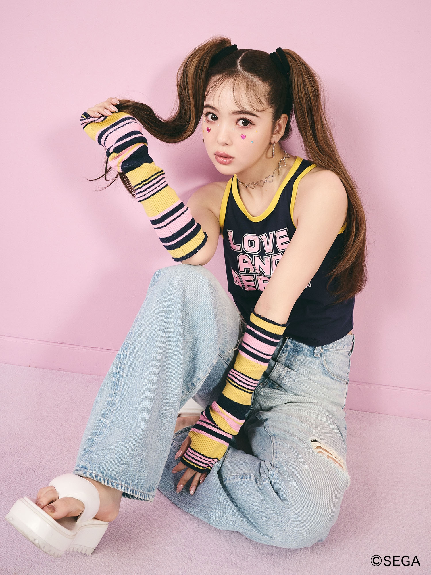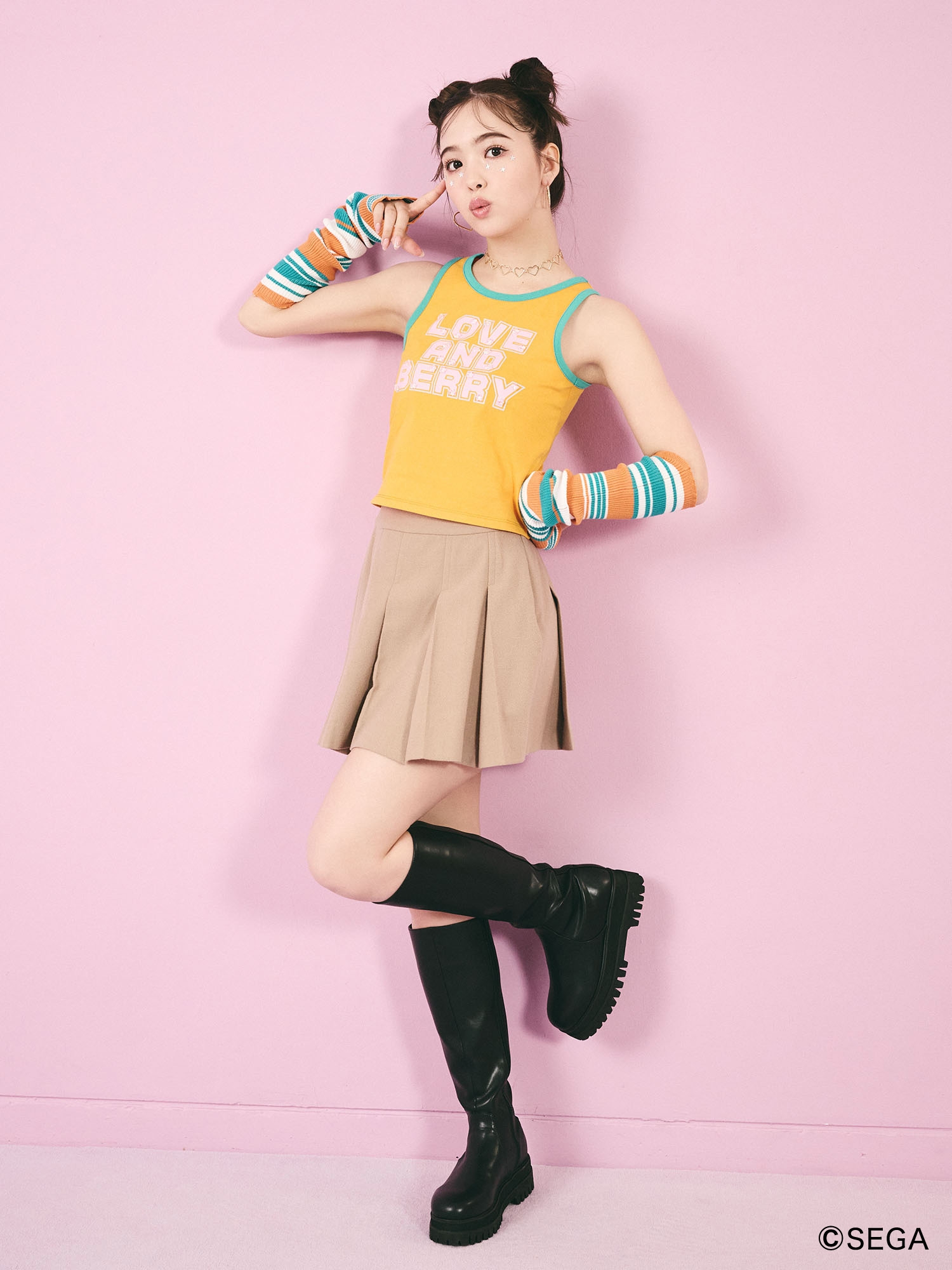 「オシャレ魔女 ラブandベリー」との出会いは、小学生の頃にショッピングモールでお母さんにおねだりしてやらせてもらったのが最初です。CALNAMURのお客様も当時プレイしていたのではと考え、喜んでもらえるかなと思って今回コラボレーションをさせていただきました。ラブベリの当時の雰囲気に合わせつつ、もし今ラブベリがあったらこんなアイテムがでているのでは?ということを考えて作ったのがアームウォーマー付きタンクトップです。キラキラの星を散りばめたり、ポップで可愛いY2Kスタイルのアイテムにしました。夏のイベントで、お友達とお揃いで可愛く写真を撮ってもらいたいです。