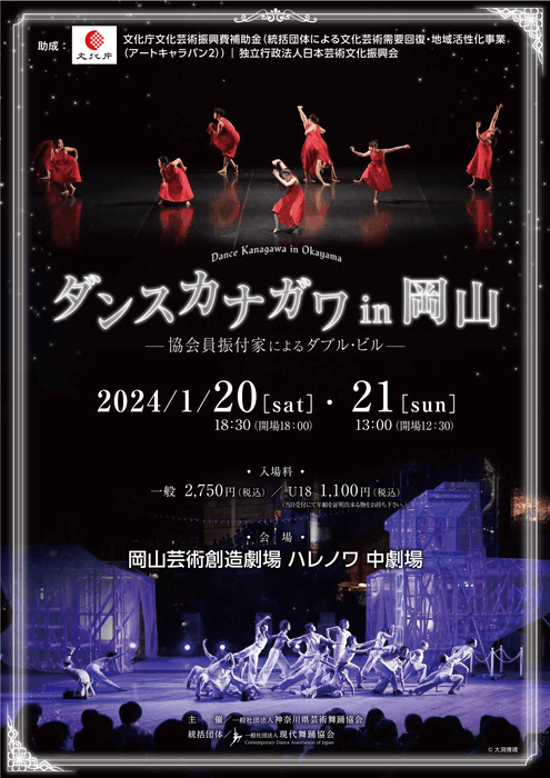 一般社団法人神奈川県芸術舞踊協会主催、『文化庁アートキャラバン2事業参加公演 ダンスカナガワin岡山』が2024年1月20日 (土) ~2024年1月21日 (日)に岡山芸術創造劇場ハレノワ中劇場(〒700-0822岡山県岡山市北区表町3-11-50)にて上演されます。
