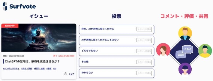 当社が提供するSNS「Surfvote」は社会にあるさまざまな課題を問題提起し、それについて誰もが簡単に意見を投票できるサービスです。Surfvoteでは「イシュー」と呼ばれる各テーマ(課題)に対して複数の選択肢から自分の意見を投票できます。また他のユーザーのコメントを見たり、評価(いいね)したりすることもできます。