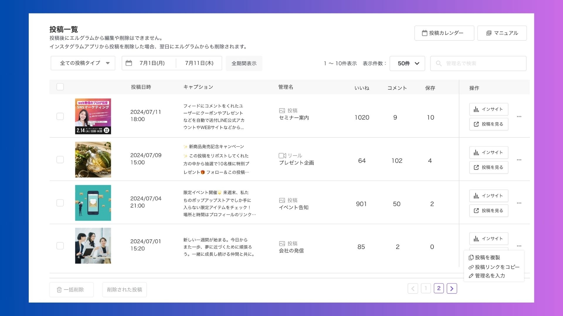 投稿機能とは、エルグラムでインスタへの投稿作成から分析までをまとめて行える機能です。