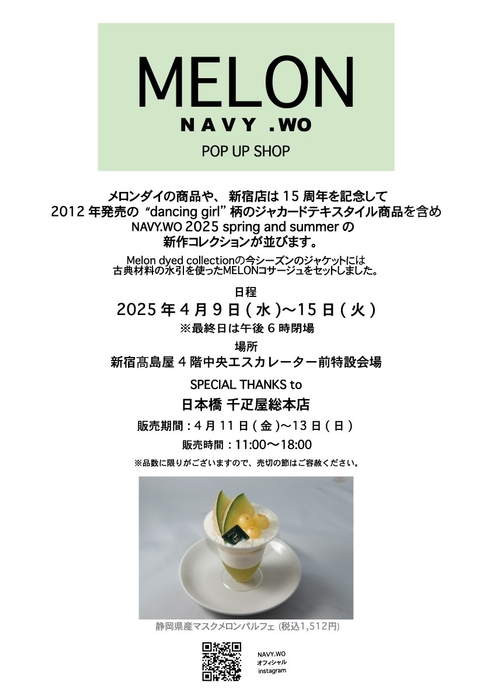 今シーズンはマスクメロンの果皮を利用して染色された商品を含むNAVY.WO 2025年春夏新作コレクションを発表。『メロン』にスポット当てた衣と食のPOP UP SHOPを合わせて開催いたします。