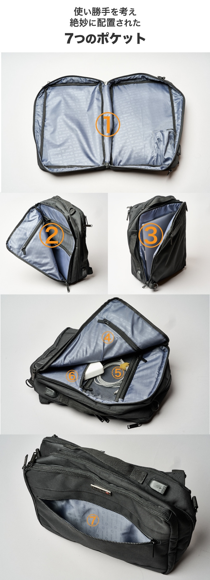 - 使い勝手を考え絶妙に配置された7つのポケット。大小含め7つのポケットであなたの生活をより快適にするお手伝いをいたします。