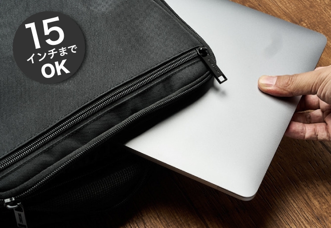 - 背中に当たる面と荷物収納面の両面共に高反発のクッションを採用することで、ノートパソコンなど精密機器を衝撃から守るよう設計されています。15インチまでのノートパソコンを収納することが可能です。