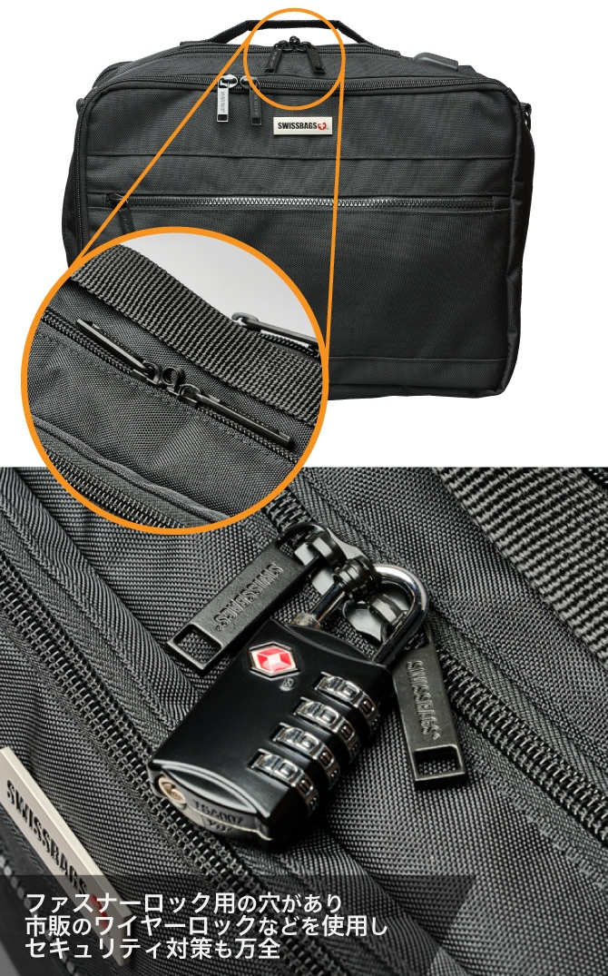 - 一番大きく開口できるファスナーにはロック用の穴を設けています。大切な資料や荷物を守るのにとても便利な機能です。海外旅行や出張時に大変助かる機能と言えます。