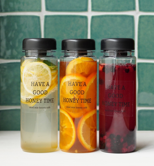フルーツを漬け込んだ蜂蜜をソーダや紅茶で割ったドリンク。砂糖不使用で、フルーツとはちみつのみで作られたドリンクは、果実の味わいをしっかり感じられ、はちみつのやさしい甘みが体になじみます。ToGoボトルでは、店内でドリンクを味わった後、さらに紅茶やソーダ、かけ放題蜂蜜などを追加することが可能。お持ち帰りのドリンクとして再活用いただけます。