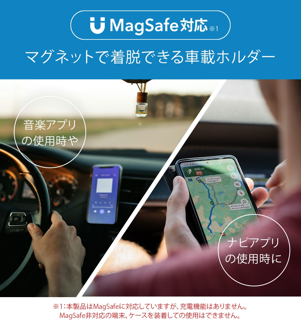 「PG-MGHLD01BK」は、MagSafeに対応したiPhoneをマグネットで着脱できる車載ホルダーです。