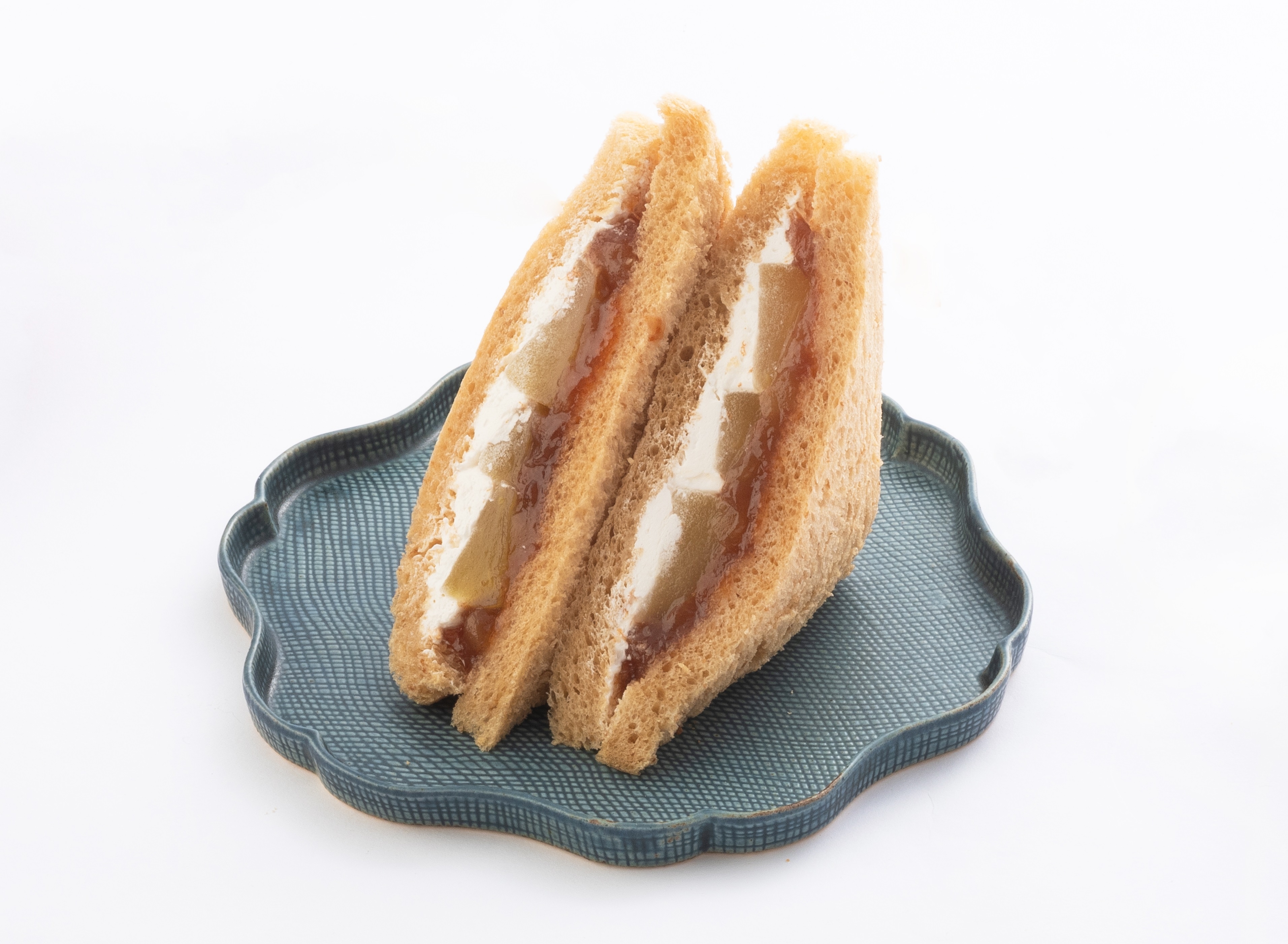 長野産・山形産のりんごを煮て、シナモンジャムとホイップクリームをあわせてサンドしました。シナモンジャムが、りんごの風味を引き立て、甘みと酸味を存分にお楽しみいただけます。