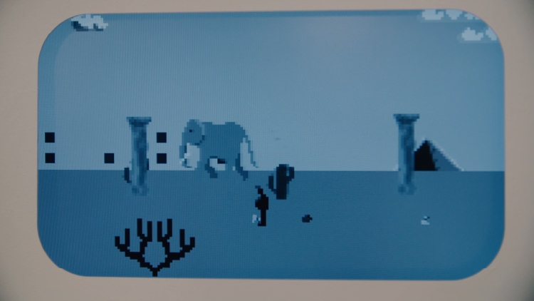モニタの映像はサイド・スクロールのゲームに則っていて、コントロールパネルの右側にあるボタンを押すことで、画面中央のキャラクタが一歩だけ進む。本来のゲームであれば障害物やゴールが設定されているのだが、本作品では、タイトルの通り右に進むことで何らかの「アニメーション」がランダムに再生される。鑑賞者は飽きるまで「歩く」ことができ、その歩数は上部のLEDに記録される。コントロールパネルの左側には「蹴る」ボタンが設置されていて、路傍の石を蹴ることができる。低解像度のピクセルアートは、個人の妄想が介入する余地を残し、体験者独自の物語を紡ぐ装置として機能する。