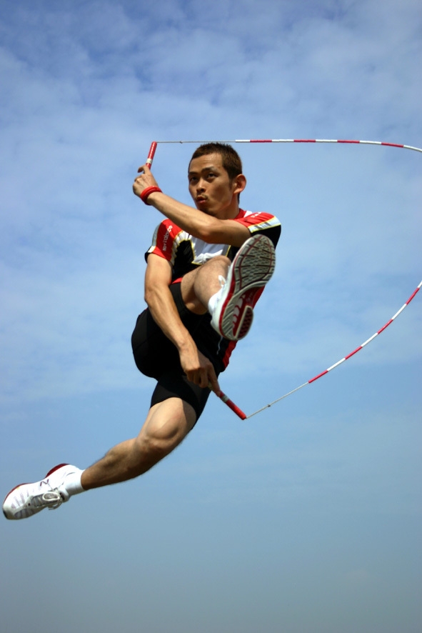 ↑跳びはじめ(上)と跳んでいる最中(下)のロープの長さの比較。前後に3倍以上伸びるため、跳ぶタイミングがつかみにくい。