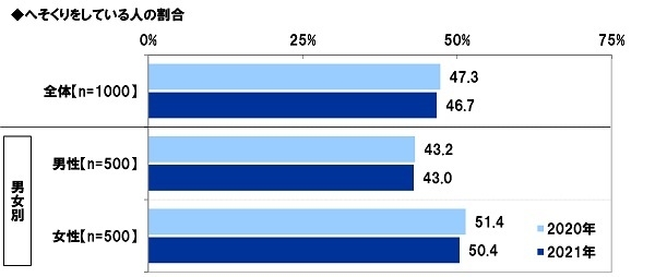 全回答者(1,000名)に、パートナー(夫・妻)に隠して蓄えているお金(へそくり)について聞いたところ、へそくりをしている人の割合は、全体では46.7%となり、男女別では男性43.0%、女性50.4%でした。