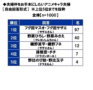夫婦仲をお手本にしたいアニメキャラ夫婦を聞いたところ、「フグ田マスオ・フグ田サザエ(サザエさん)」(97名)がダントツとなり、“ペアルックが似合いそうなアニメキャラ夫婦”とあわせ二冠となりました。続いて、2位「野原ひろし・野原みさえ(クレヨンしんちゃん)」(40名)、3位「磯野波平・磯野フネ(サザエさん)」(12名)、4位「孫悟空・チチ(ドラゴンボール)」(7名)、5位「野比のび助・野比玉子(ドラえもん)」(4名)となりました。