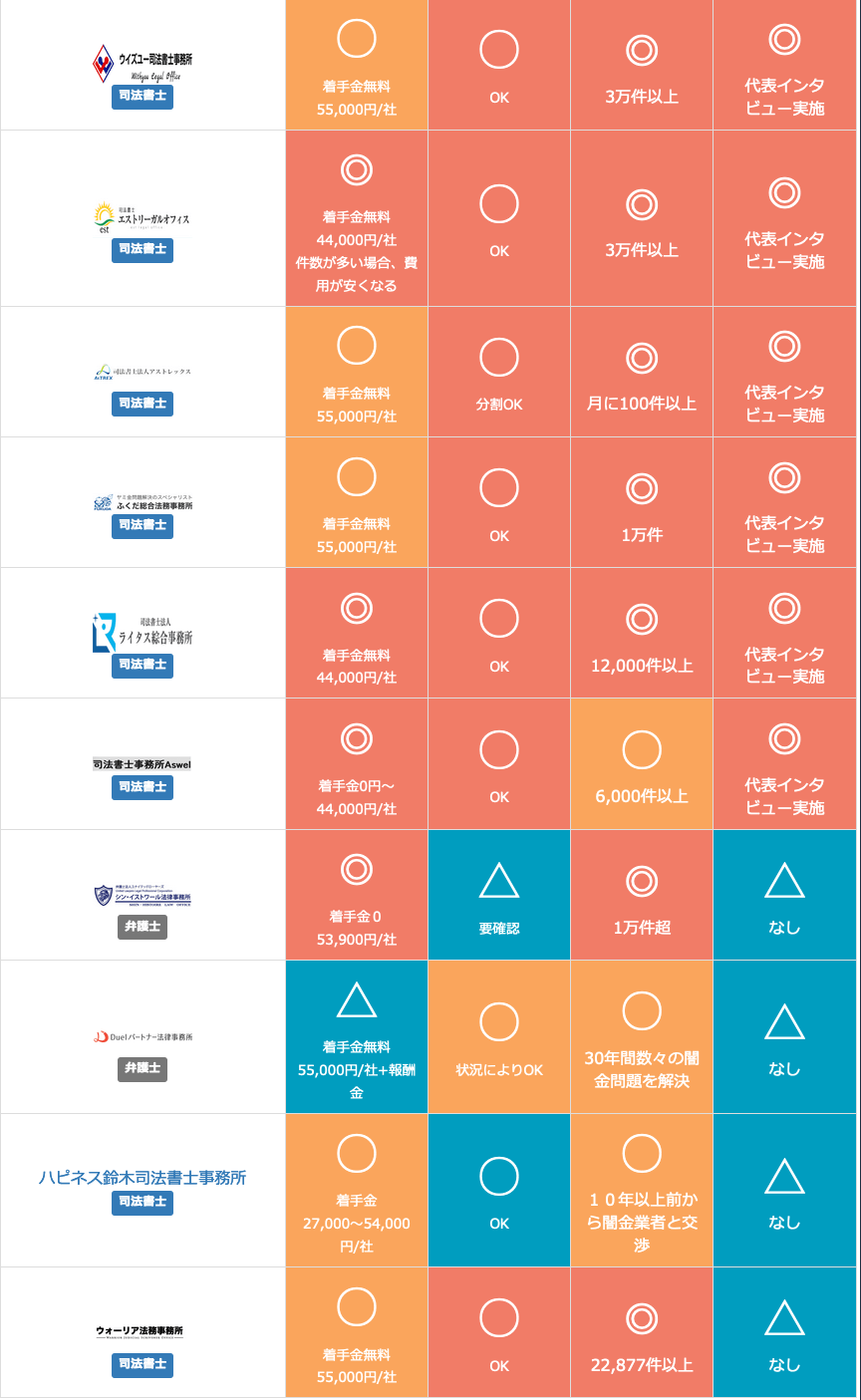 闇金への対応実績・経験を重視しつつ、闇金解決費用、代表の人柄や事務所の雰囲気等が判断できるインタビュー記事、口コミも参考に10つの事務所をおすすめしています。