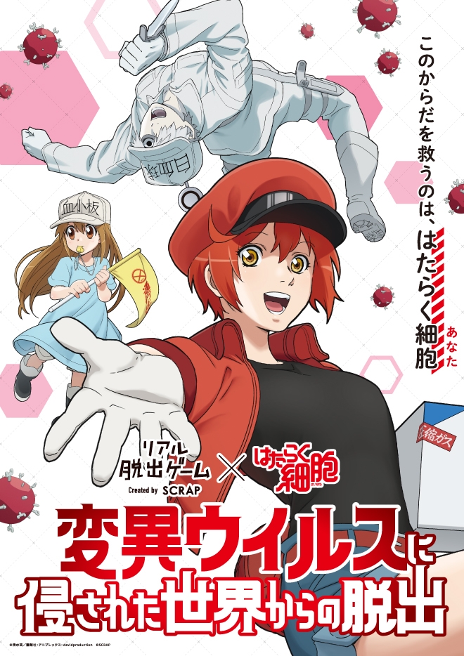 株式会社 SCRAP(所在地:東京都渋谷区、代表者:加藤隆生)は、2022年4月22日(金)より東京、名古屋、福岡、札幌、大阪、仙台、岡山、横浜の全国8都市で順次開催される、人気テレビアニメ『はたらく細胞』とコラボレーションした新作リアル脱出ゲーム『変異ウイルスに侵された世界からの脱出』の描き下ろしビジュアルと新CMを公開いたします。