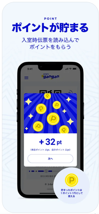 アプリ会員として入店するだけでポイントがもらえます。カラオケを楽しむたびにポイントが貯まり、次回以降の利用がお得に!