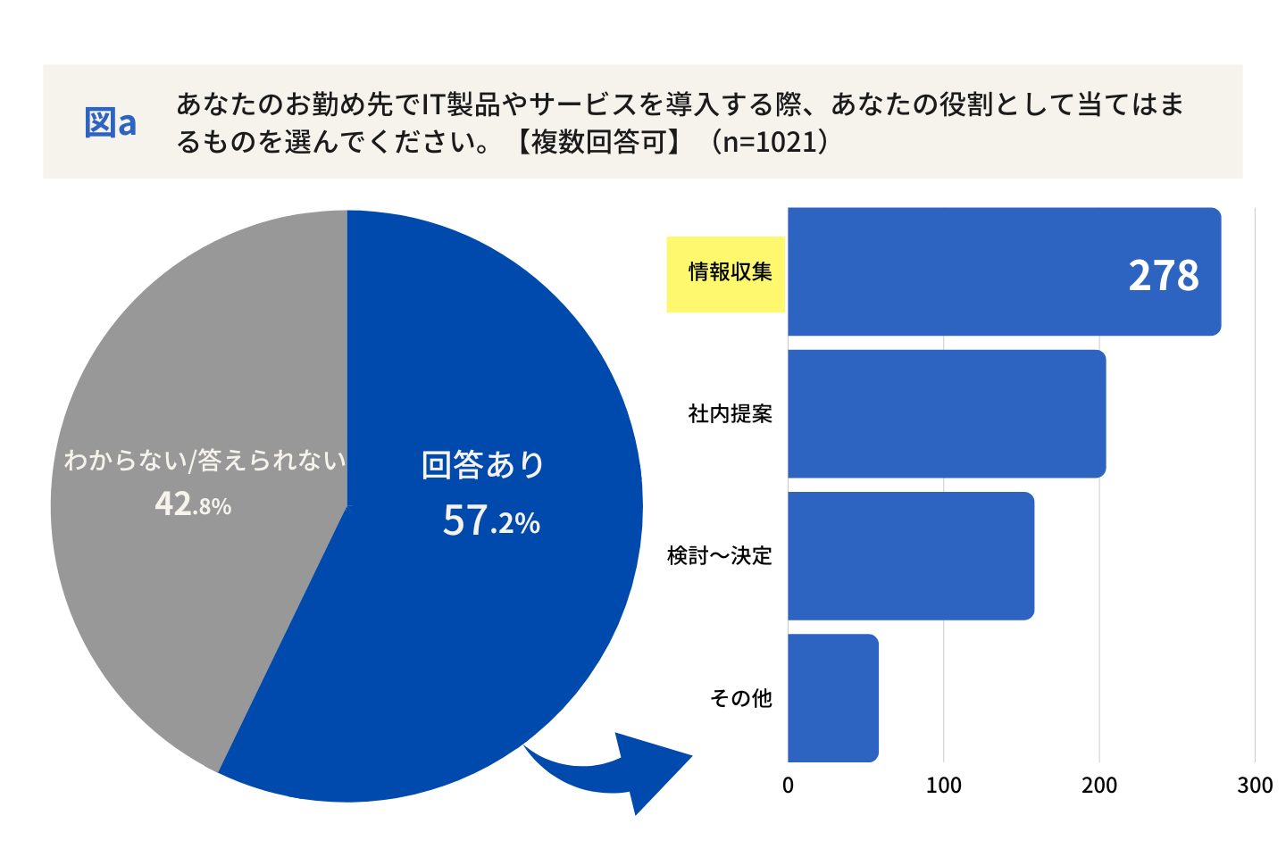 まず「サービスを導入する際、どのような役割を担っているか」と質問したところ、具体的な回答があったのは全体の回答のうち57.2%でした。その中で、第1位の回答は「情報収集」。多くの製品が類似の機能や特徴を持つ場合、まずはどの製品を社内で検討するか、情報収集を経て選択肢を絞るプロセスが重要となります。そのためか、この「情報収集」の段階には50代が関わっている割合が多く、業務の経験値をもとに自社によりフィットした製品やサービスを選ぶに欠かせない世代と示唆する結果となりました。
