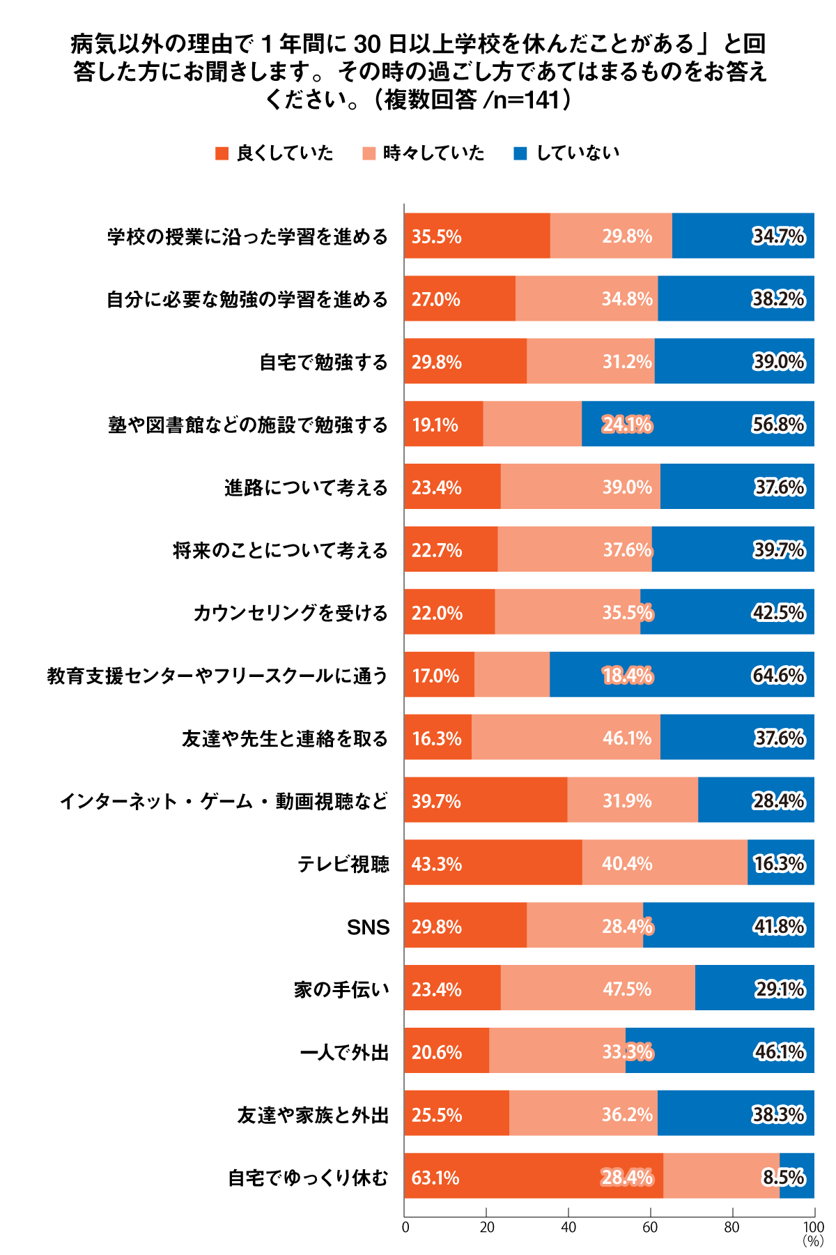 不登校中の過ごし方でも小・中・高校生は勉強を進めたり、将来について考えたり、今後に向けた行動を取っています。不登校になると気分の浮き沈みは当然あるでしょうが、自分の状態を受け入れて前向きに行動するのは良い傾向ではないでしょうか。