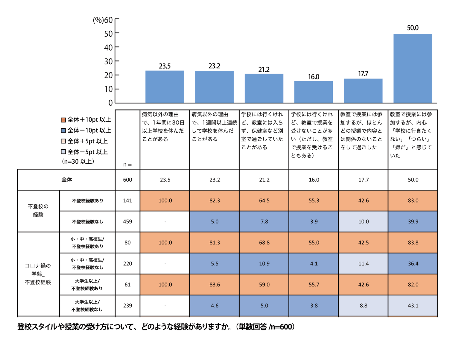 そして、「教室で授業には参加するが、内心『学校に行きたくない』『つらい』『嫌だ』と感じていた」は不登校経験の有無に関わらず50.0%以上いる結果となりました。