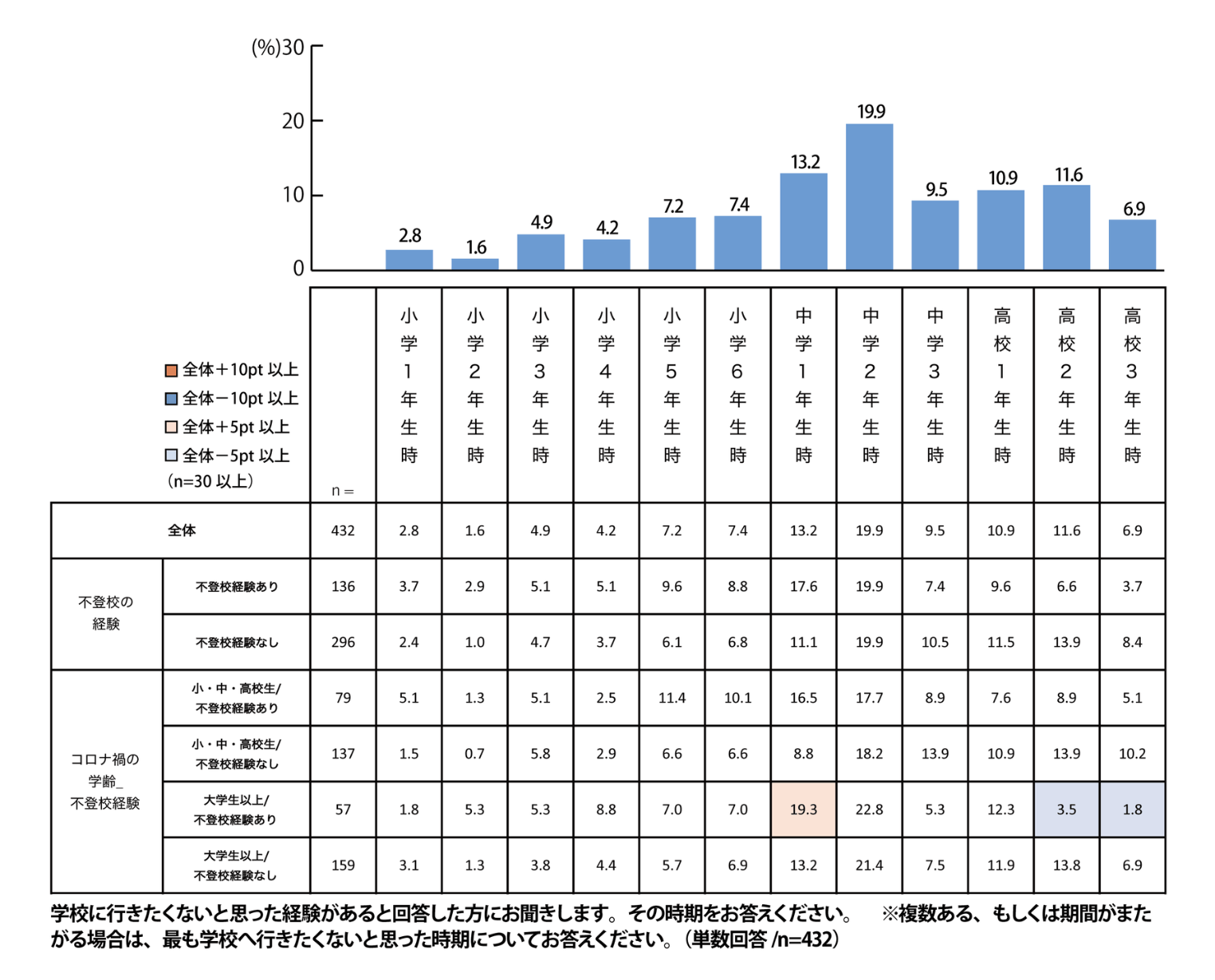 Q2. 学校に行きたくないと思った経験があると回答した方にお聞きします。その時期をお答えください。※複数ある、もしくは期間がまたがる場合は、最も学校へ行きたくないと思った時期についてお答えください。(単数回答/n=432)