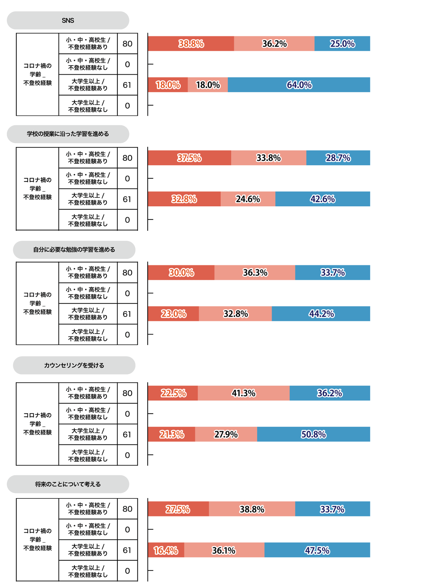 コロナ禍の学齢不登校経験別で見ると、小・中・高校生/不登校経験ありは「SNS」が75.0%と全体の割合を大きく上回りました。また、「学校の授業に沿った学習を進める」「自分に必要な勉強の学習を進める」「将来のことについて考える」「カウンセリングを受ける」といった前向きな行動の割合も総じて高くなっています。