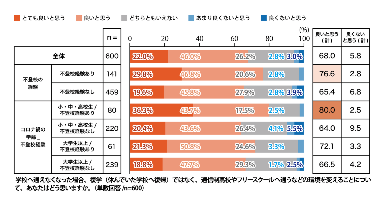 不登校になった後、復学を目指すのではなく環境を変えることについては「とても良いと思う」が22.0%、「良いと思う」が46.0%となり、合計すると68.0%でした。コロナ禍の学齢不登校経験別でみると、小・中・高校生/不登校経験ありは「良いと思う計(とても良いと思う+良いと思う)」の割合が80.0%にのぼり、環境を変えることを好意的に捉えていることが分かります。