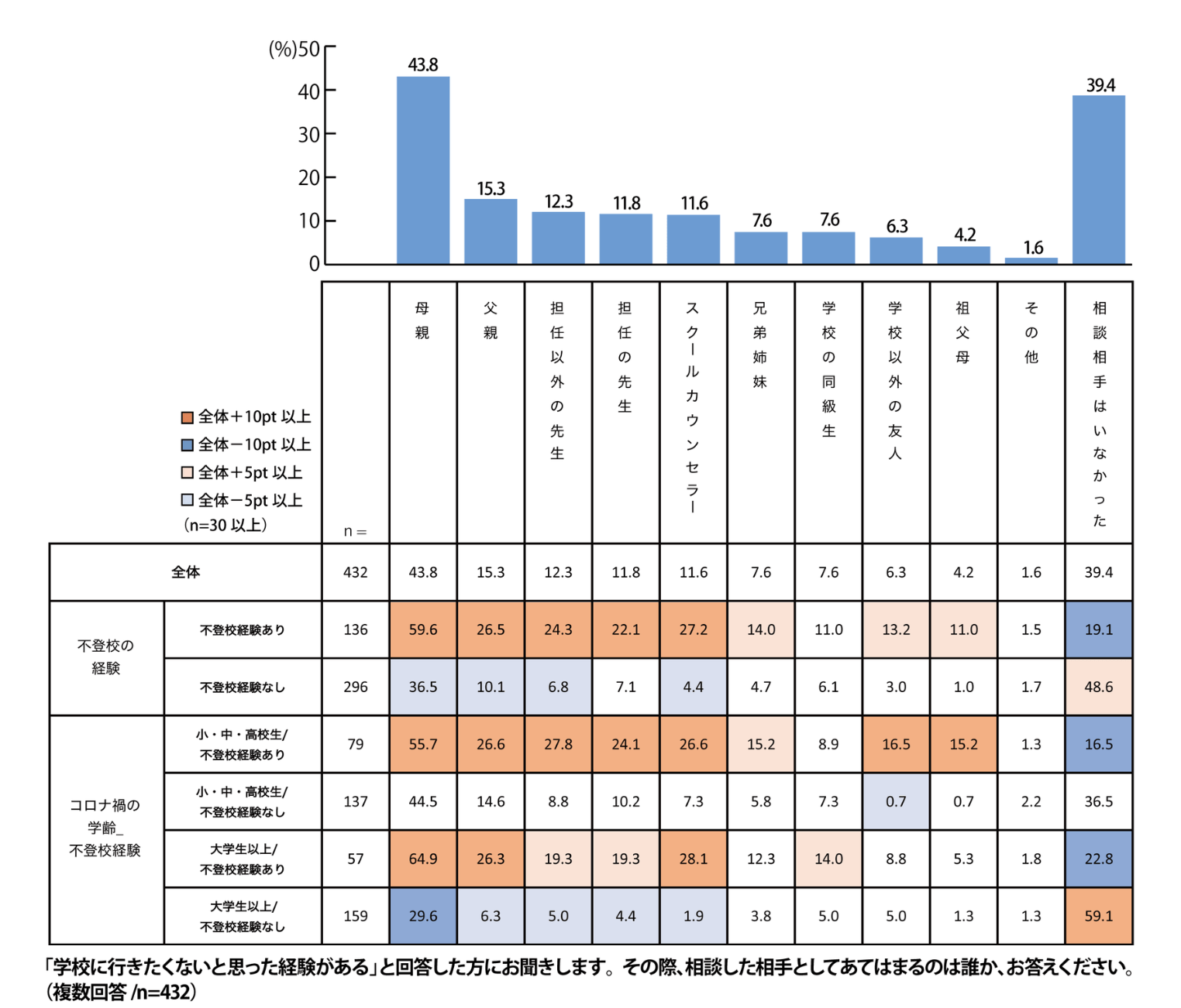 Q4. 「学校に行きたくないと思った経験がある」と回答した方にお聞きします。その際、相談した相手としてあてはまるのは誰か、お答えください。(複数回答/n=432)