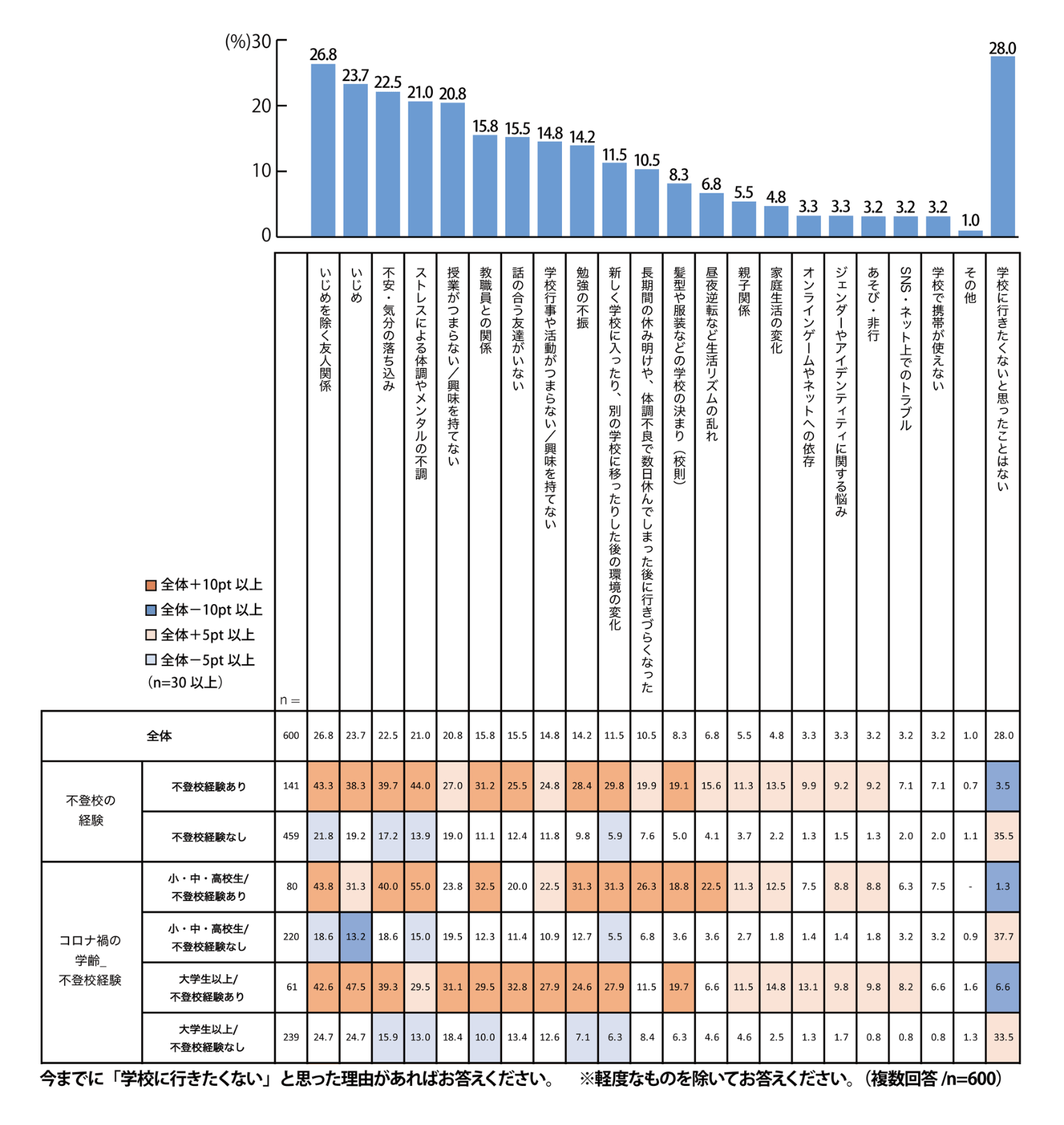 一方、大学生以上/不登校経験ありは「いじめ」「いじめを除く友人関係」「不安・気分の落ち込み」の順になっており、小・中・高校生との違いが見て取れます。