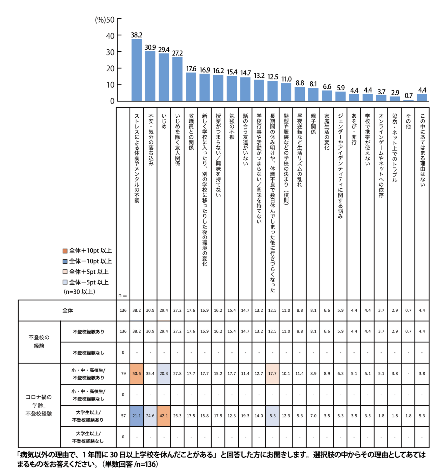Q5. 「病気以外の理由で、1年間に30日以上学校を休んだことがある」と回答した方にお聞きします。その理由としてあてはまるものをQ1.の「学校に行きたくない理由」の中からお答えください。(単数回答/n=136)