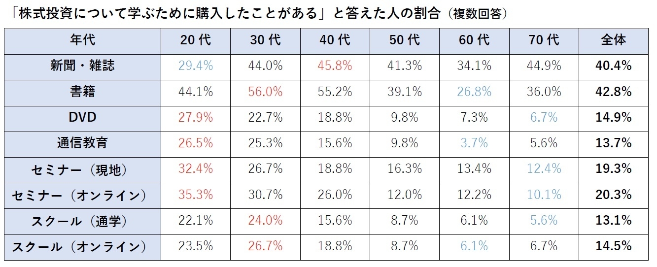 なお、全体として最も割合が高かったのは「書籍」の42.8%で、手頃であることから学習の入り口になっていることがわかります。その一方で、「DVD」や「通信教育」「セミナー」「スクール」といった、ある程度のお金を投じる必要のあるツールについては20代・30代といった若い世代の割合が高く、ここからも、若い人ほど株式投資の学習に積極的にお金を使っている実態が見えてきます。