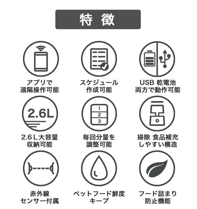 専用アプリがあり、外出先からでも給餌の時間設定や量を調整することができます。