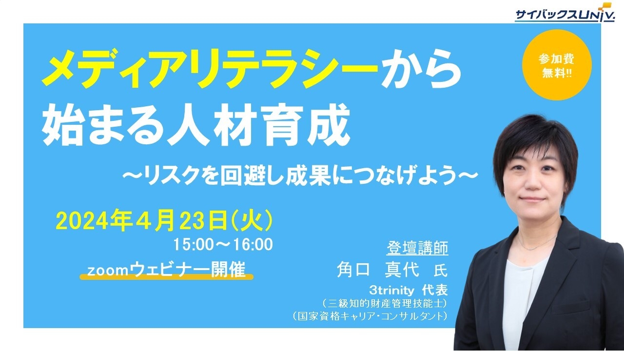 なお、2024年4月23日(火)に無料セミナー『メディアリテラシーから始まる人材育成~リスクを回避し成果につなげよう~』を開催いたします。セミナー講師は、国家資格キャリア・コンサルタントでもあり、本eラーニングの制作に携わった3trinity代表の角口 真代氏がつとめます。業務成果につなげるSNSの安全かつ効果的な活用方法と、リスク回避のためのポイントを解説しながら、メディアリテラシーから広がる人材育成の可能性についての情報を提供します。