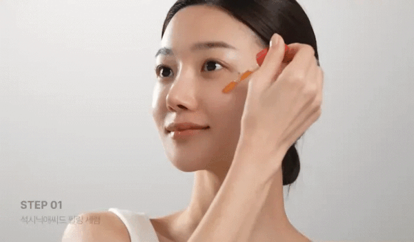 ①洗顔後、肌の水気をふき取り、悩みのある部位に適量の「レッドアクネピーリングセラム」出し、1~2分間優しくローリングします。