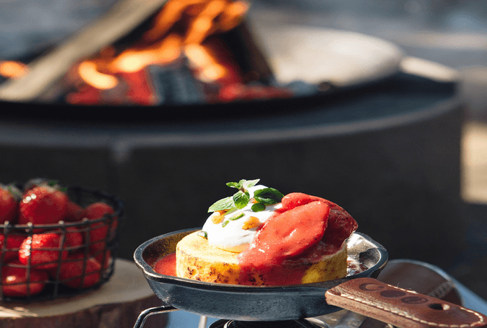 ウェルカムスイーツとして、旬のフルーツとともに、スキレットで仕上げたバウムクーヘンを提供しています。果実の粒感を楽しめる温かい苺のソースをあしらった一品です。甘いバウムクーヘンに、程よい酸味の苺を合わせることで、苺の味わい深さを堪能できます。
