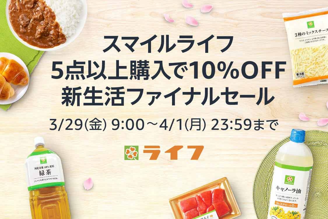Amazon上のライフネットスーパーでは3月29日(金)9時00分から4月1日(月)23時59分までのセール期間、ライフ人気のプライベートブランドの「スマイルライフ」の商品が5点以上のご購入で10%OFFとなります。対象商品は300点以上になり、チルド食品やカットサラダ、加工食品、日用雑貨品など多数取り揃えております。
