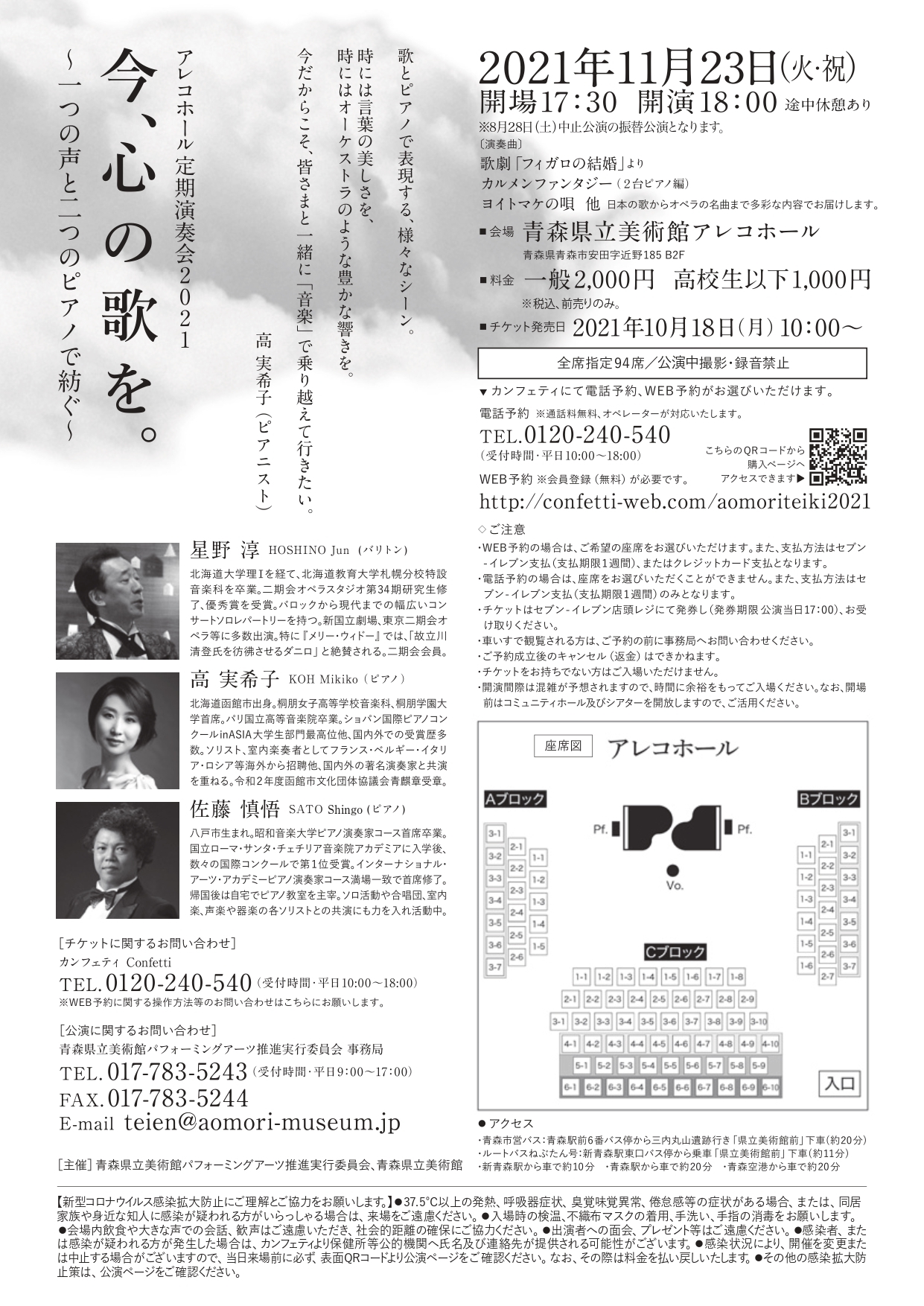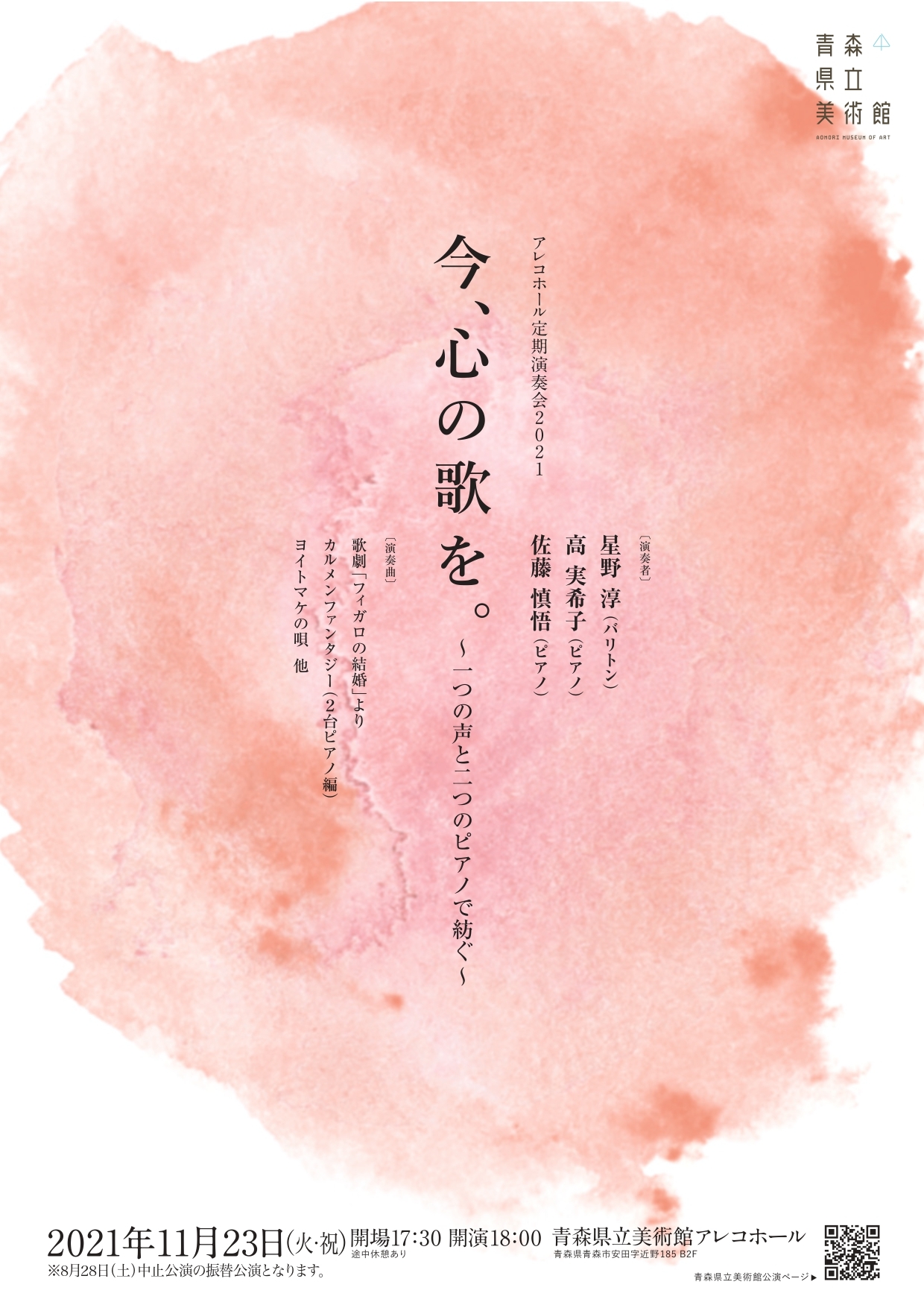 青森県立美術館パフォーミングアーツ推進実行委員会主催による、アレコホール定期演奏会2021「今、心の歌を。」~一つの声と二つのピアノで紡ぐ~が2021年11月23日(火・祝)に青森県立美術館アレコホール(青森県青森市)にて開催されます。チケットはカンフェティ(運営:ロングランプランニング株式会社、東京都新宿区、代表取締役:榑松 ⼤剛)にて10⽉18⽇(月)より発売開始です。