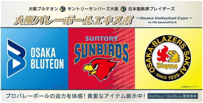 ひらかたパーク(枚方市枚方公園町1-1)にて展示イベント「大阪バレーボールエキスポ」を8月10日(土)から9月29日(日)に開催します。本イベントには、10月から新たに始まるバレーボールのトップリーグ『大同生命SV.LEAGUE MEN』に所属し、大阪を拠点に活動する3つの男子チーム「大阪ブルテオン」、「サントリーサンバーズ大阪」、「日本製鉄堺ブレイザーズ」が参加します。「大阪からバレーボール界を盛り上げる」を合言葉にライバル同士となる3チームとひらかたパークが手を組んだ初の合同展示イベントは、大変貴重な機会となります。展示アイテムには現役の日本代表選手着用ユニフォームなどがあり、プロバレーボールを身近に感じることができます。観覧は無料ですのでぜひご来場ください。