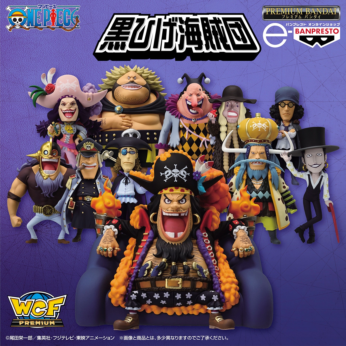 現四皇【マーシャル・D・ティーチ】を提督に10人の巨漢船長が船を率いる「黒ひげ海賊団」を全員揃って初の『ワールドコレクタブルフィギュア』化。個性的なキャラクターをシリーズの特徴あるデフォルメデザインで表現しました。